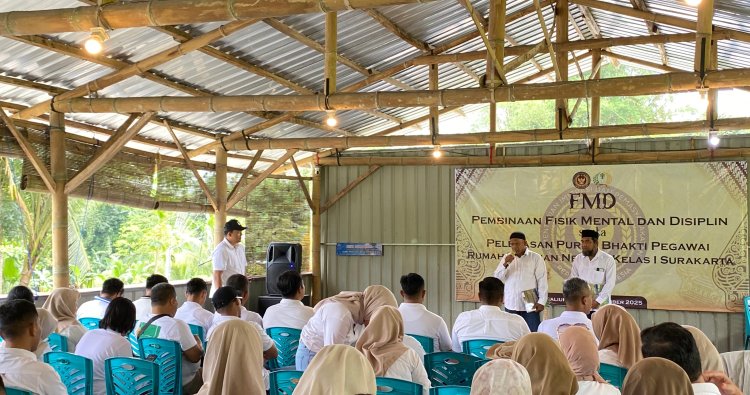 Surakarta - Rutan Kelas I Surakarta menggelar momen penuh haru dan penghormatan dalam rangkaian kegiatan Pembinaan Fisik Mental dan Disiplin (FMD) 2025 dengan melepas dua pegawai purnabakti yang telah mengabdikan diri selama puluhan tahun, Sabtu (15/11). Acara yang berlangsung di sela kegiatan FMD tersebut menjadi bentuk apresiasi institusi atas dedikasi panjang dua sosok yang selama ini menjadi bagian penting dalam perjalanan Rutan Surakarta.