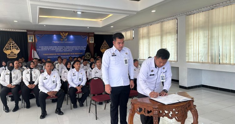 Surakarta - Rutan Kelas I Surakarta menegaskan komitmennya dalam memberantas peredaran narkoba, handphone ilegal, dan barang terlarang melalui kegiatan penandatanganan komitmen bersama yang digelar di Aula Baharudin Loppa dan diikuti seluruh pejabat struktural serta pegawai Rutan Surakarta secara daring melalui aplikasi Zoom, Senin (20/10).