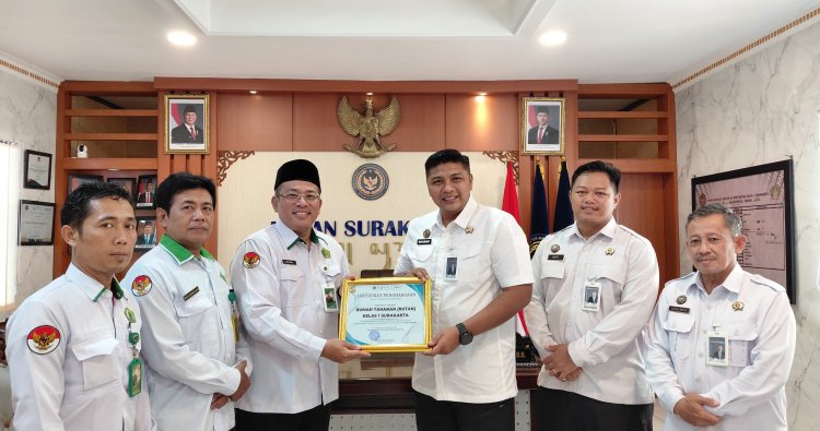 Surakarta - Program Pembinaan Kepribadian bagi Warga Binaan Pemasyarakatan (WBP) Rutan Kelas I Surakarta kembali peroleh apresiasi penghargaan dari Kantor Kementerian Agama Kota Surakarta. Bertempat di ruang Kepala Rutan Surakarta, Kantor Kementerian Agama Kota Surakarta menyerahkan sertifikat penghargaan kepada Rutan Surakarta atas keberhasilan penyelenggaraan layanan keagamaan melalui program unggulan Pondok Pesantren Sareh Semeleh, Selasa (11/11). Penyerahan penghargaan ini dilakukan langsung oleh Kepala Kemenag Kota Surakarta, Ahmad Ulin Nur Hafsun dan diterima oleh Kepala Rutan Surakarta.